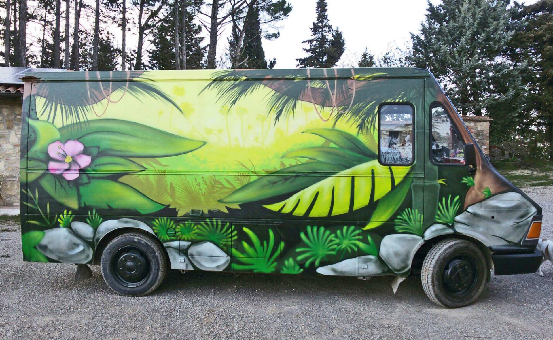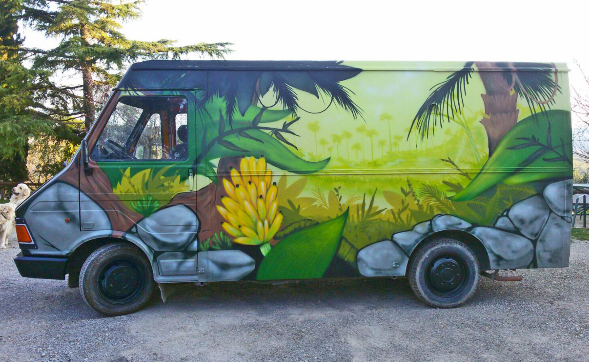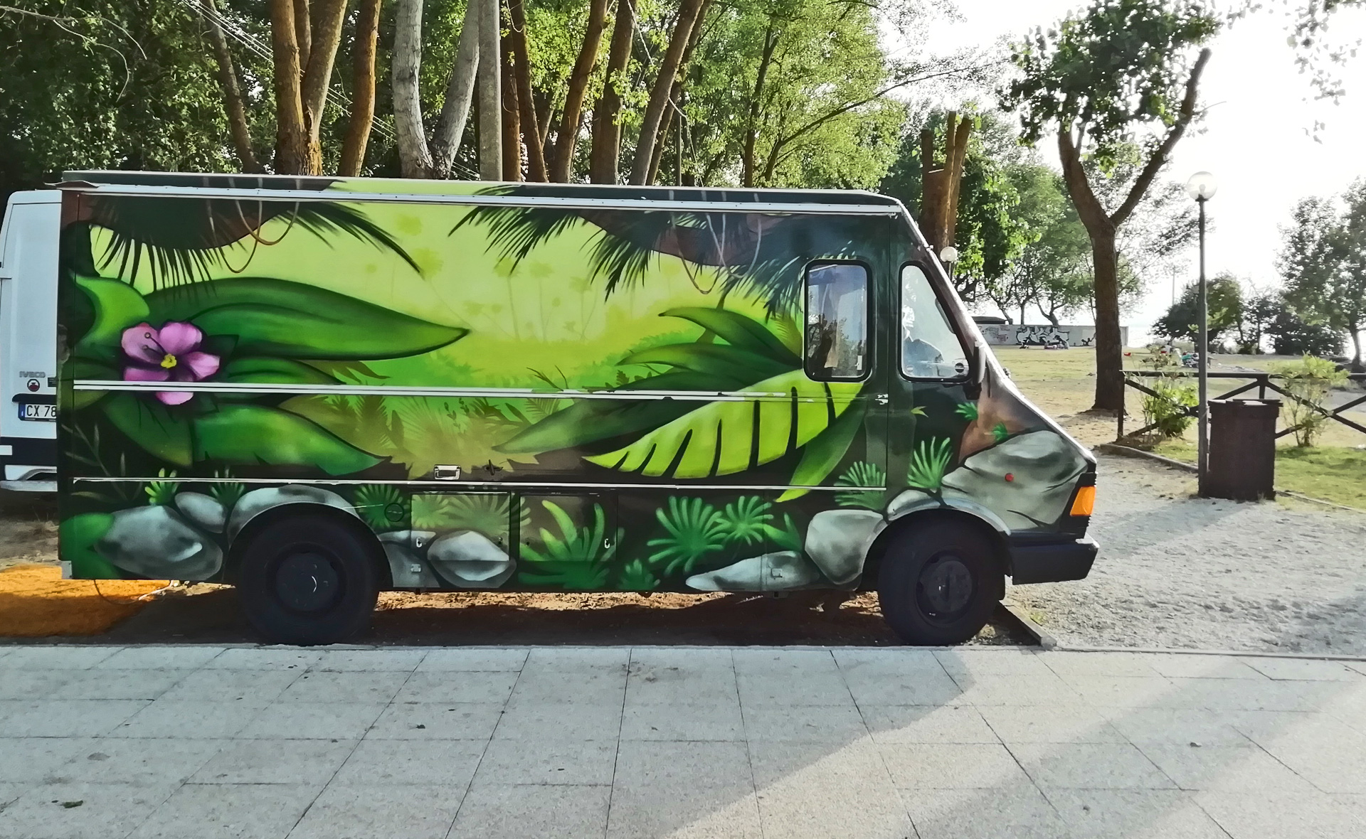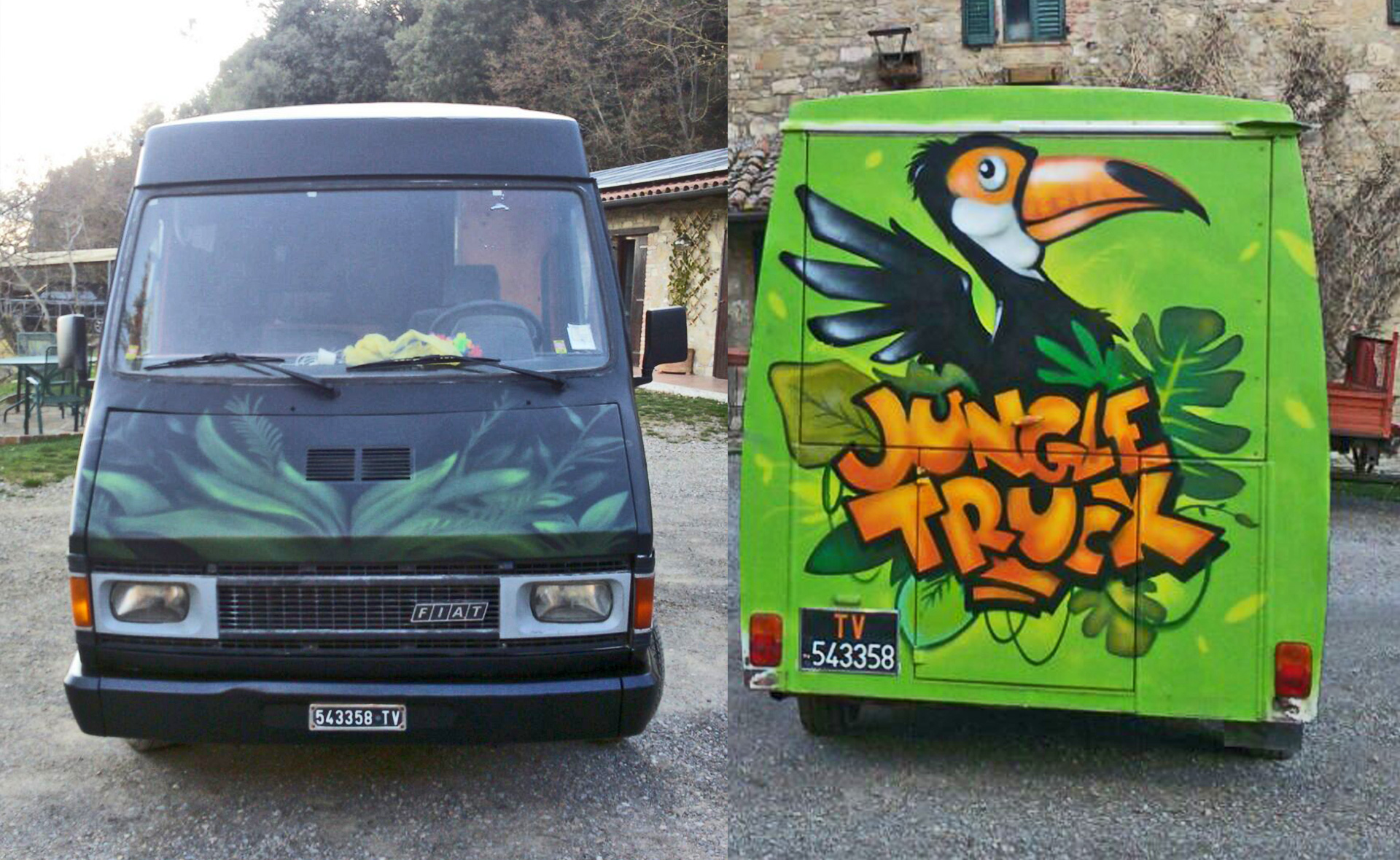 Furgone customizzato realizzato con vernice spray ad alta copertura e resistenza. La carrozzeria è stata completamente personalizzata a tema, con il logo della compagnia sul retro.